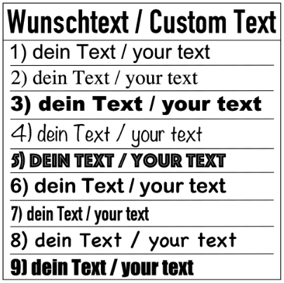 Gib deinen gewünschten Text bitte genau so ins Textfeld ein, wie er erscheinen soll – Groß- und Kleinschreibung, mit oder ohne Sonderzeichen. Bitte beachte: Emojis sind nicht möglich.