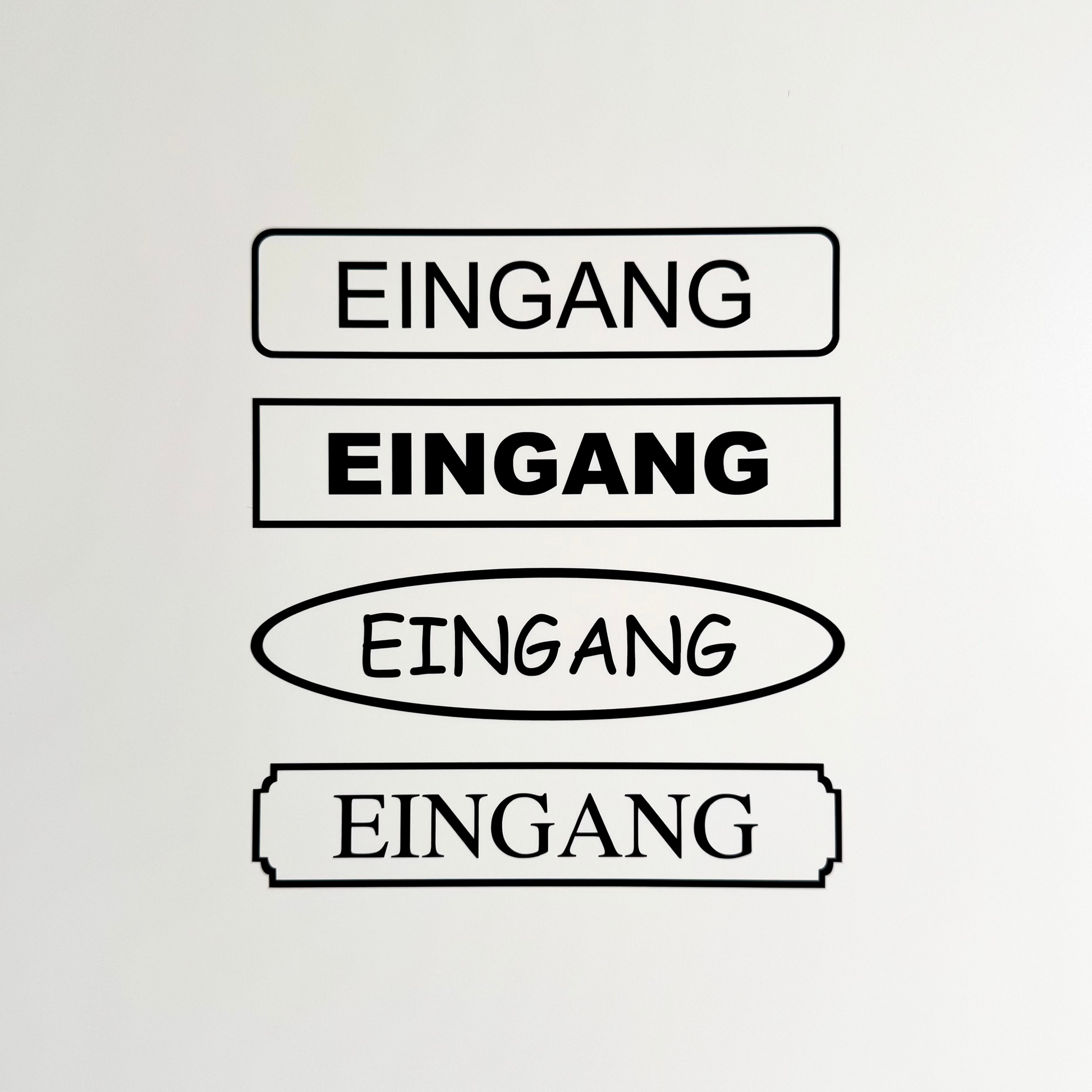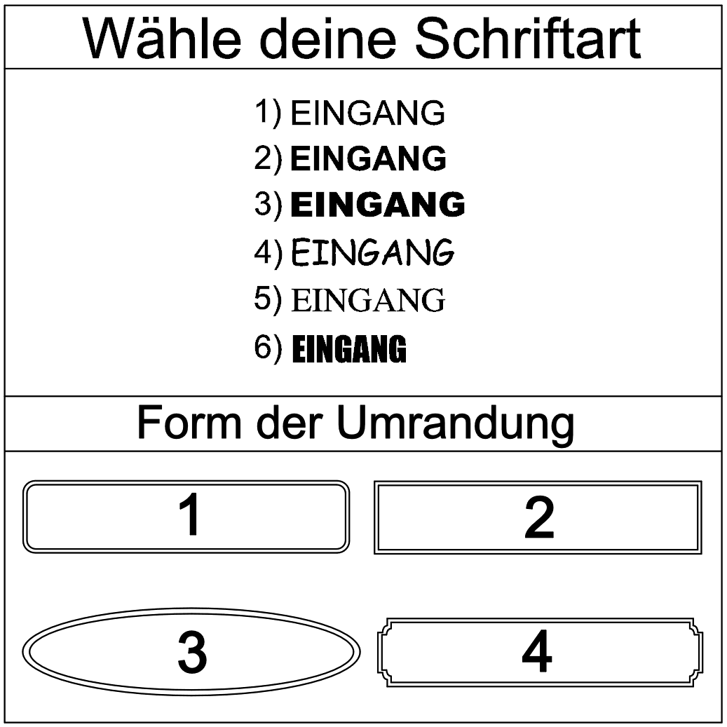 Bitte wähle deine gewünschte Schriftart (1–6) und den gewünschten Rahmenstil (kein Rahmen oder 1–4) im Dropdown-Menü aus. Diese Angaben sind verpflichtend, um deinen Aufkleber individuell anzufertigen.