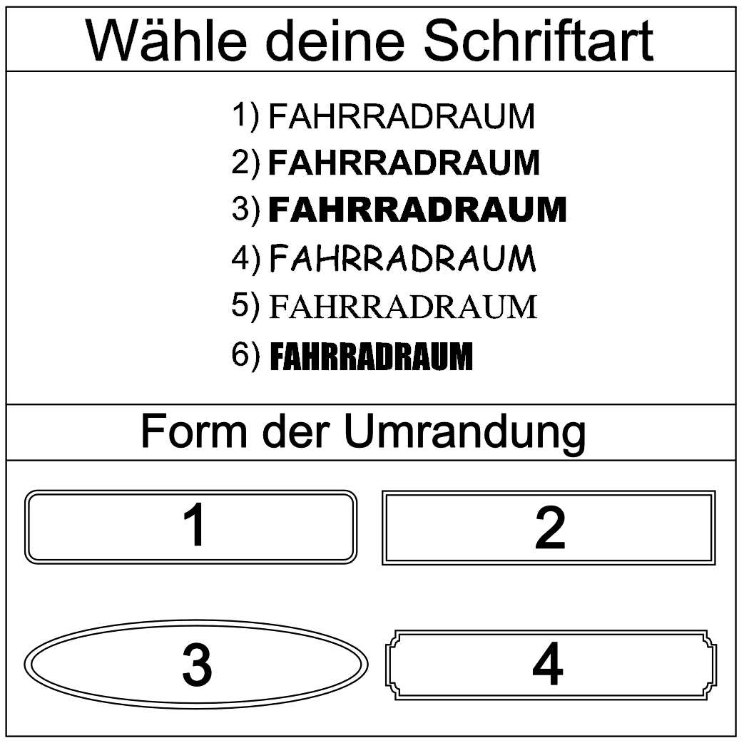 Bitte wähle deine gewünschte Schriftart (1–6) und den gewünschten Rahmenstil (kein Rahmen oder 1–4) im Dropdown-Menü aus. Diese Angaben sind verpflichtend, um deinen Aufkleber individuell anzufertigen.