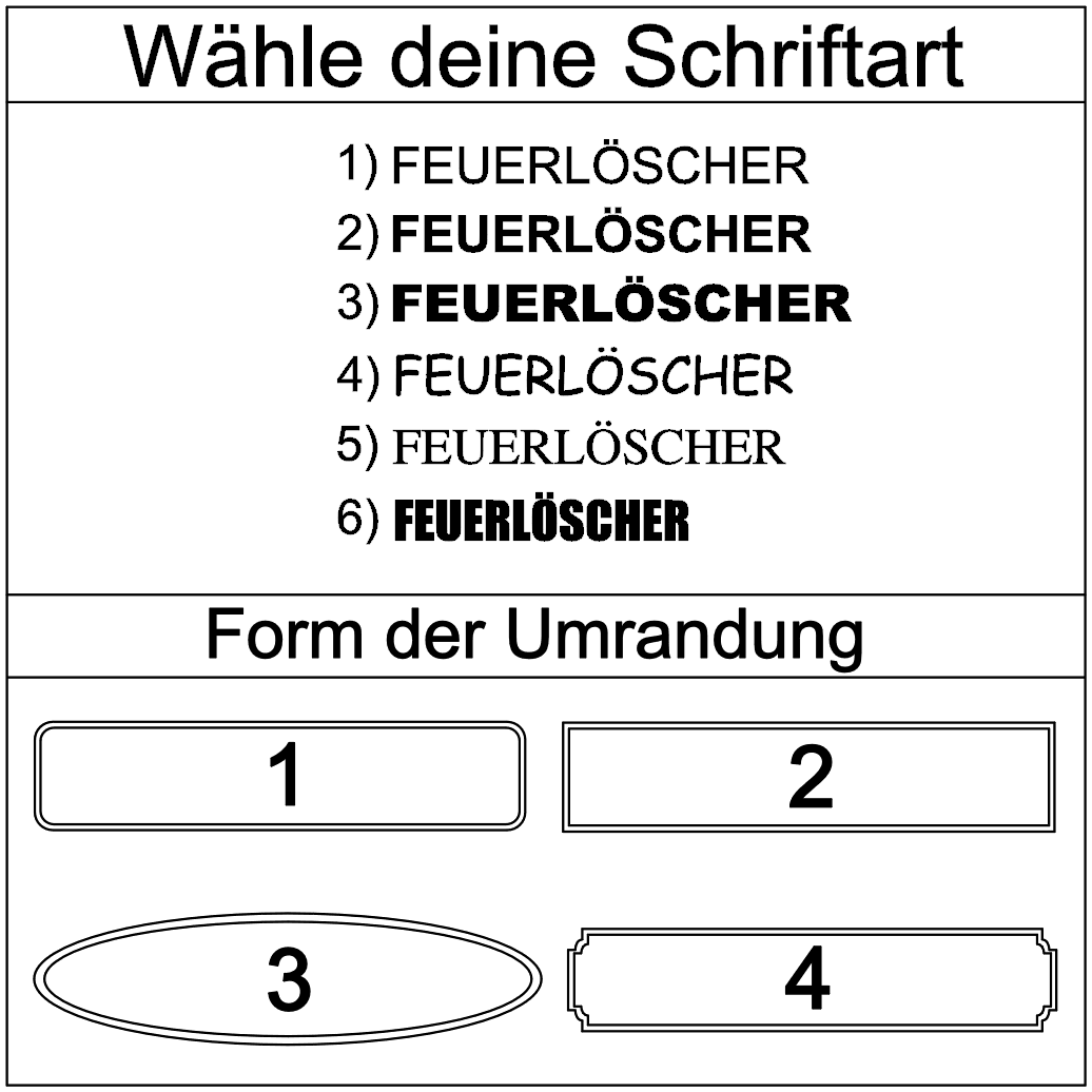 Bitte wähle deine gewünschte Schriftart (1–6) und den gewünschten Rahmenstil (kein Rahmen oder 1–4) im Dropdown-Menü aus. Diese Angaben sind verpflichtend, um deinen Aufkleber individuell anzufertigen.