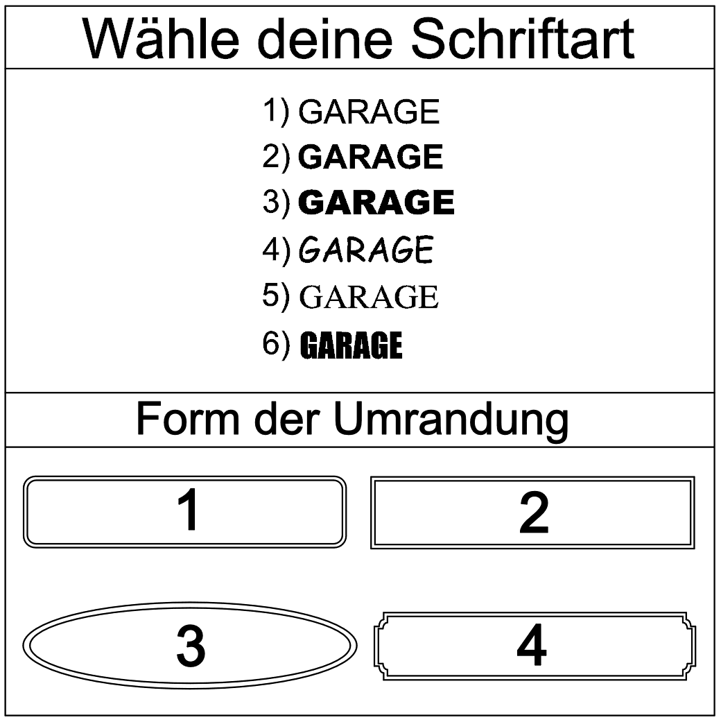 Bitte wähle deine gewünschte Schriftart (1–6) und den gewünschten Rahmenstil (kein Rahmen oder 1–4) im Dropdown-Menü aus. Diese Angaben sind verpflichtend, um deinen Aufkleber individuell anzufertigen.