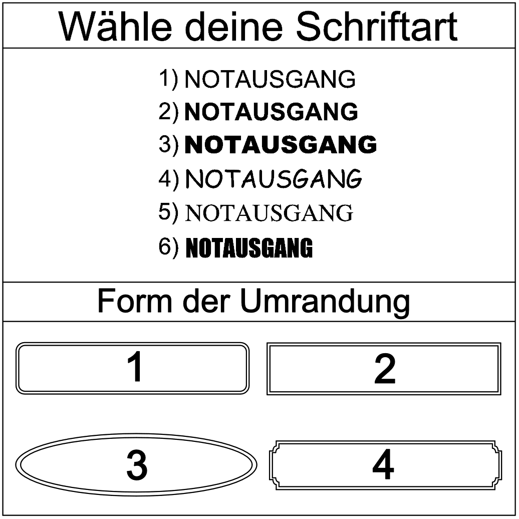 Bitte wähle deine gewünschte Schriftart (1–6) und den gewünschten Rahmenstil (kein Rahmen oder 1–4) im Dropdown-Menü aus. Diese Angaben sind verpflichtend, um deinen Aufkleber individuell anzufertigen.