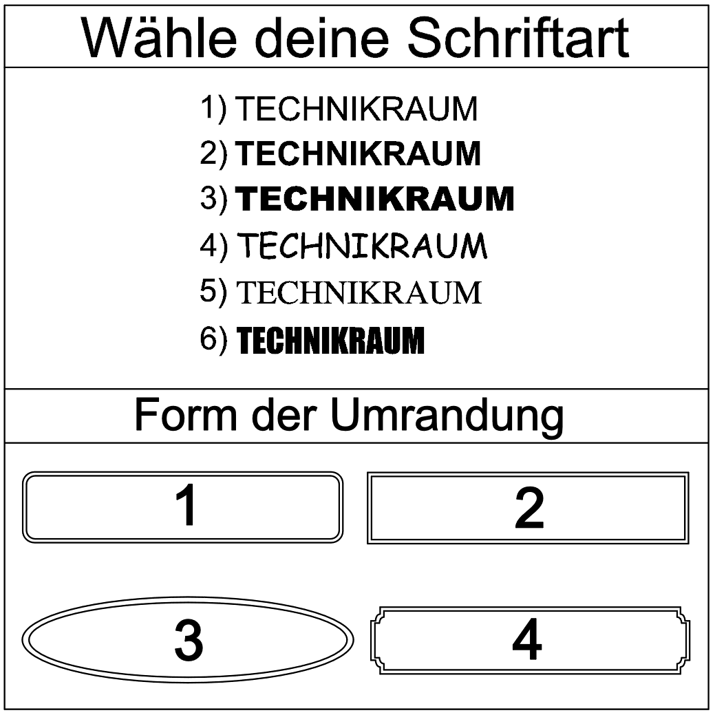 Bitte wähle deine gewünschte Schriftart (1–6) und den gewünschten Rahmenstil (kein Rahmen oder 1–4) im Dropdown-Menü aus. Diese Angaben sind verpflichtend, um deinen Aufkleber individuell anzufertigen.