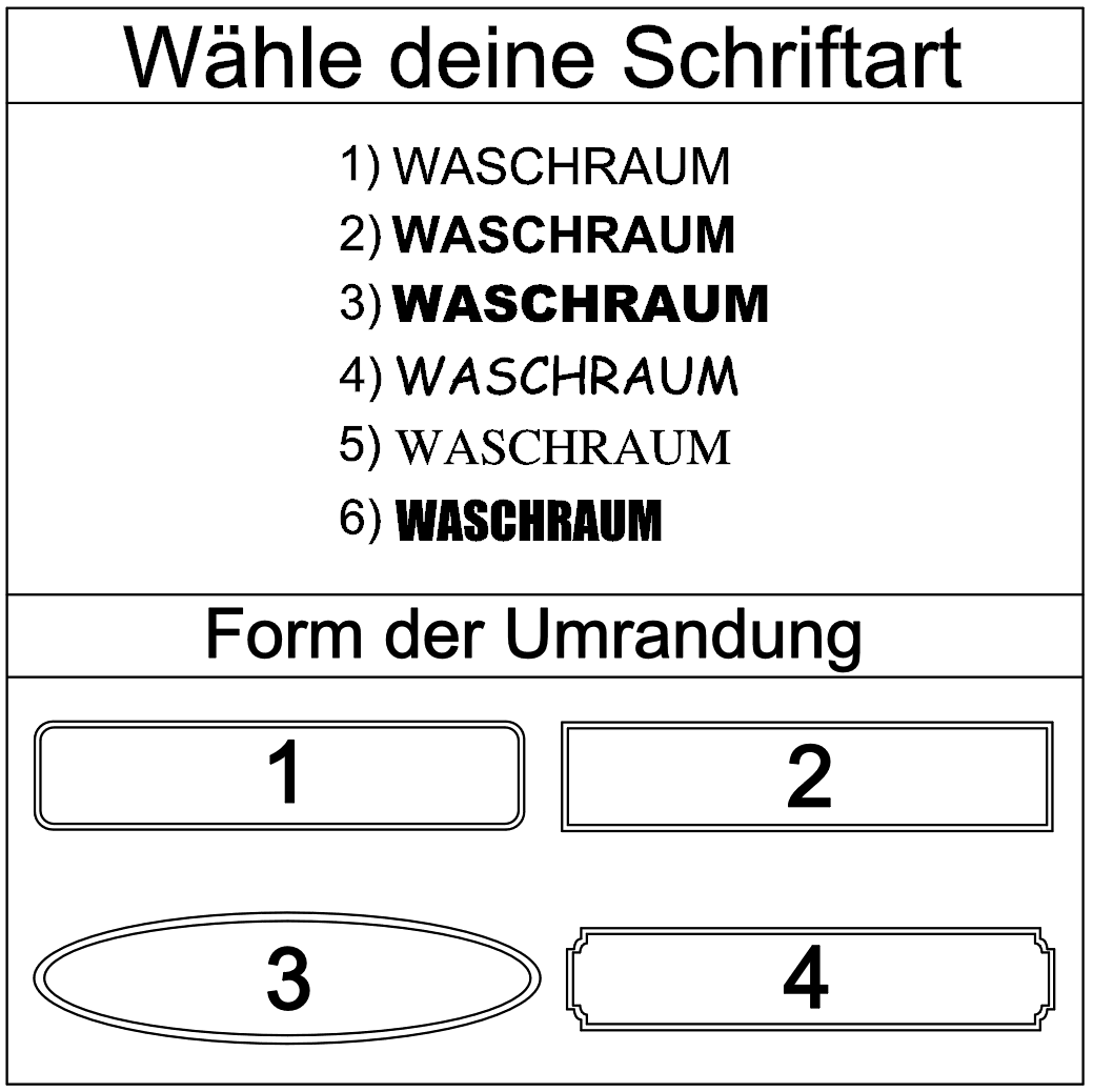 Bitte wähle deine gewünschte Schriftart (1–6) und den gewünschten Rahmenstil (kein Rahmen oder 1–4) im Dropdown-Menü aus. Diese Angaben sind verpflichtend, um deinen Aufkleber individuell anzufertigen.