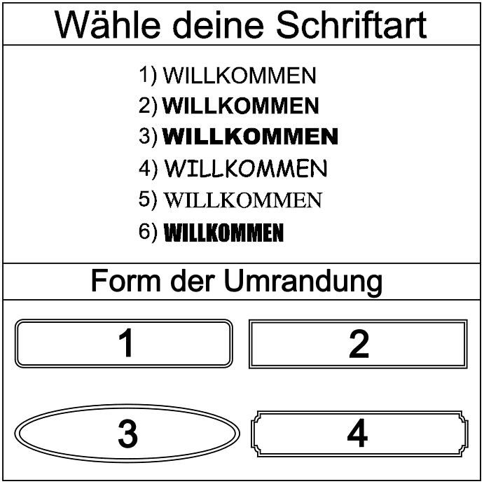 Bitte wähle deine gewünschte Schriftart (1–6) und den gewünschten Rahmenstil (kein Rahmen oder 1–4) im Dropdown-Menü aus. Diese Angaben sind verpflichtend, um deinen Aufkleber individuell anzufertigen.