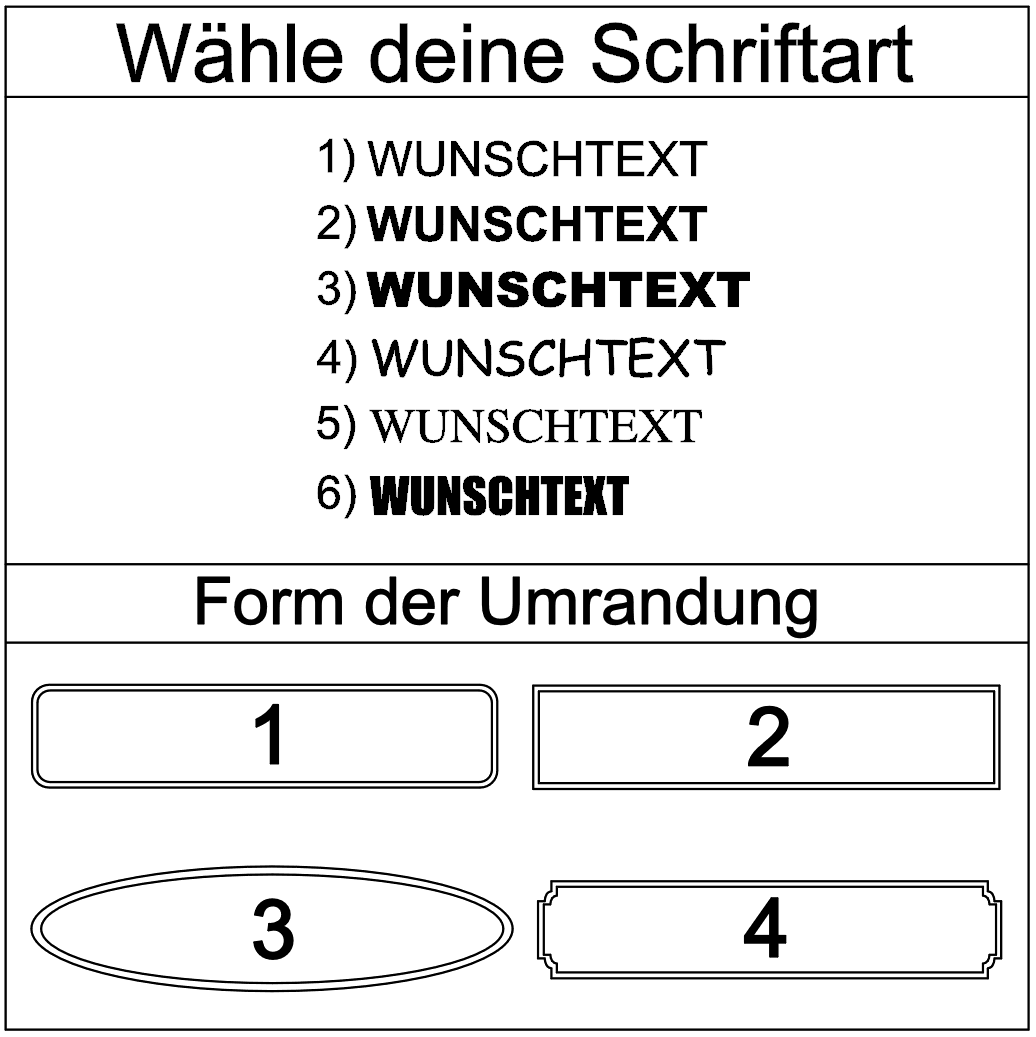Bitte wähle deine gewünschte Schriftart (1–6) und den gewünschten Rahmenstil (kein Rahmen oder 1–4) im Dropdown-Menü aus. Diese Angaben sind verpflichtend, um deinen Aufkleber individuell anzufertigen.